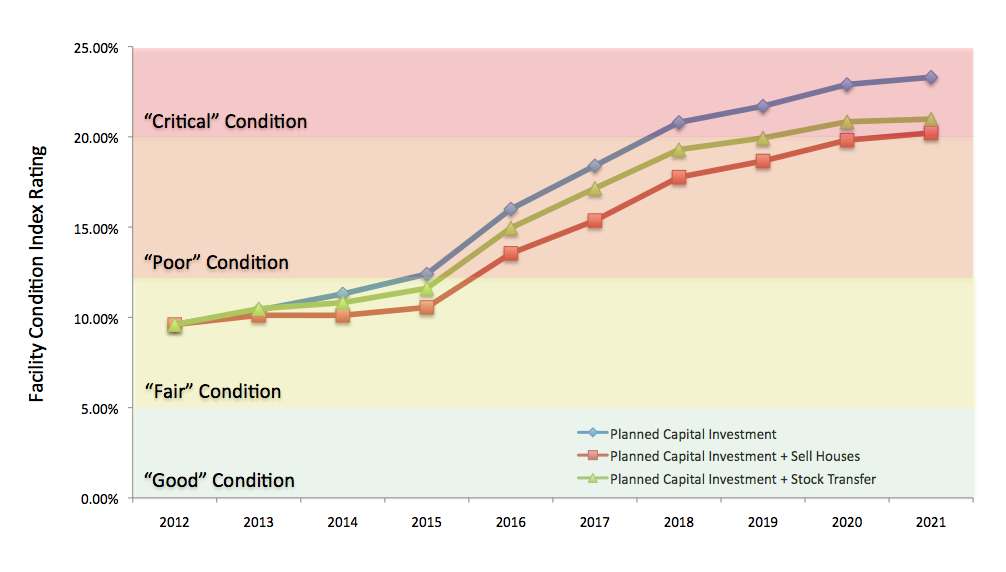 Selling TCHC houses (the red line) only delays entry into the critical zone. By 2015, TCHC’s buildings are following the same trajectory as if the sales had never happened. By 2021 and every year thereafter, TCHC’s buildings will be in a critical state.